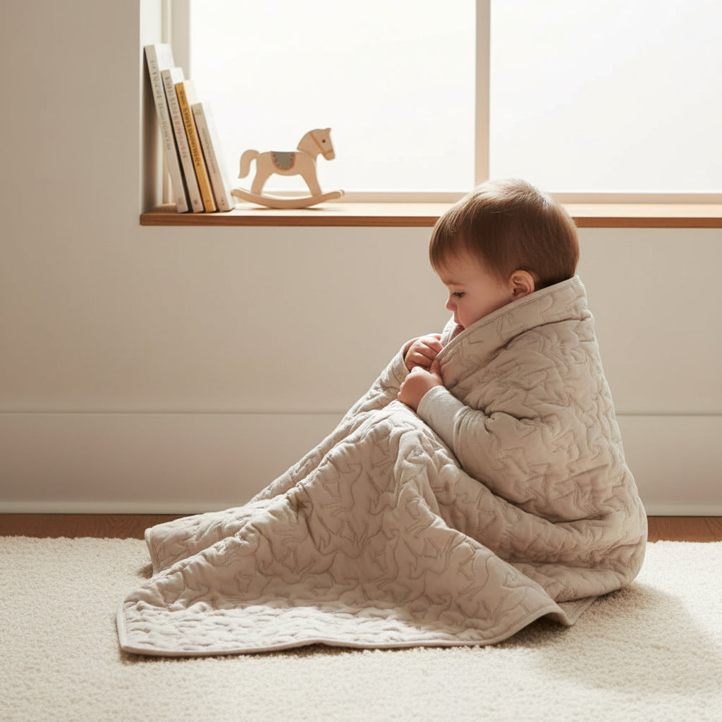 - Tan fabric with horse motifs quilted on both sides for a luxurious feel