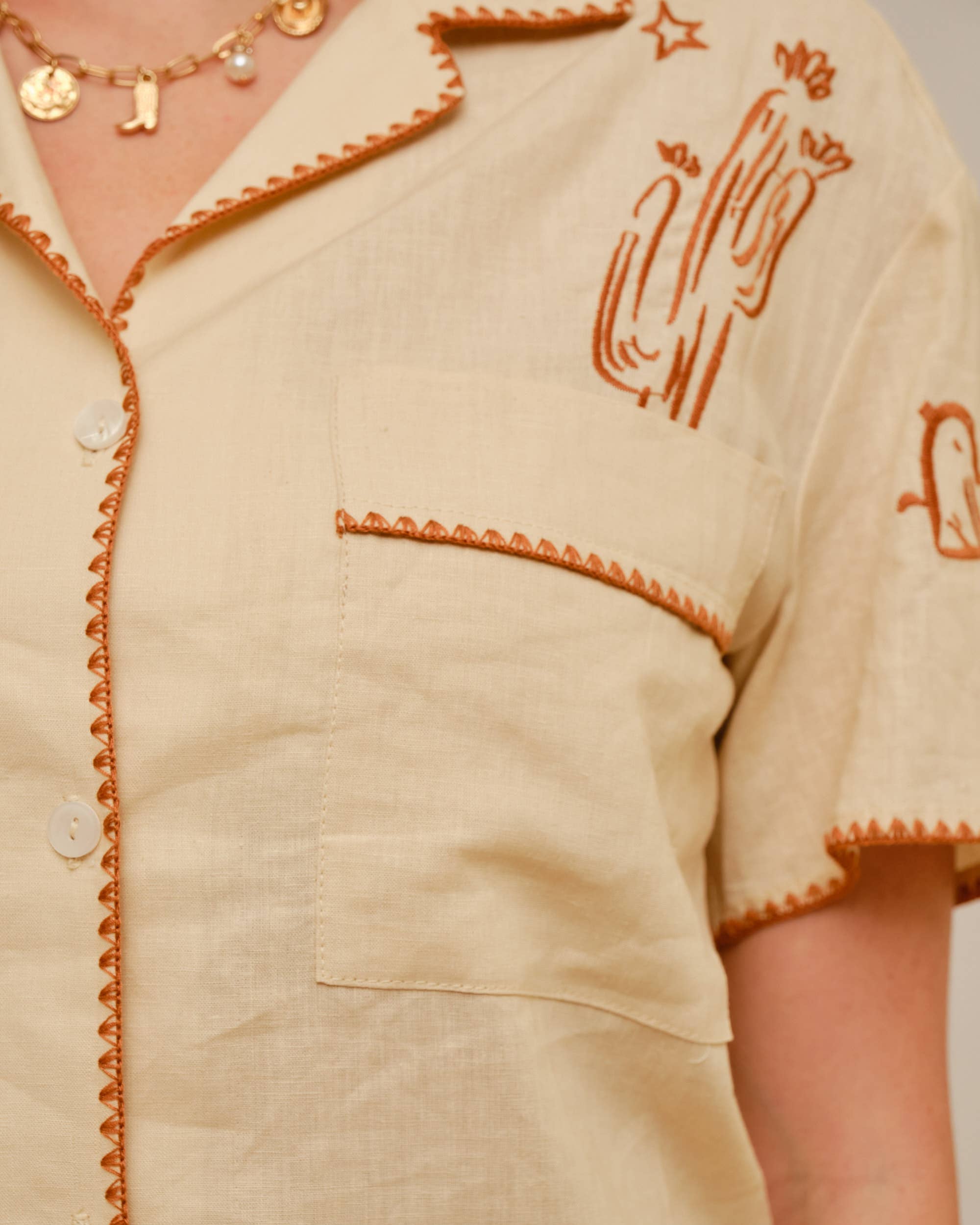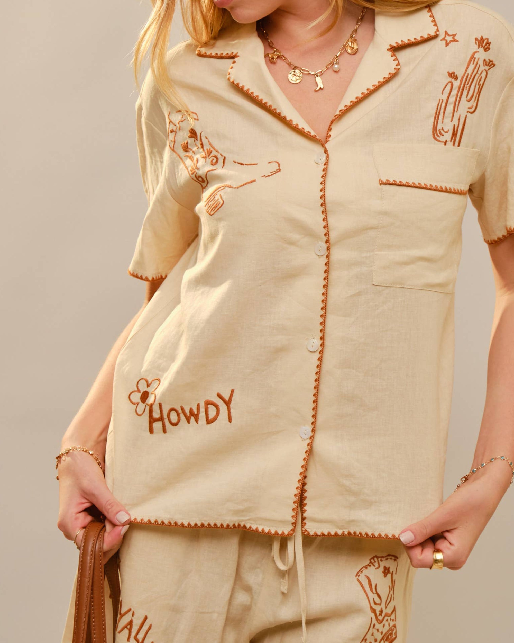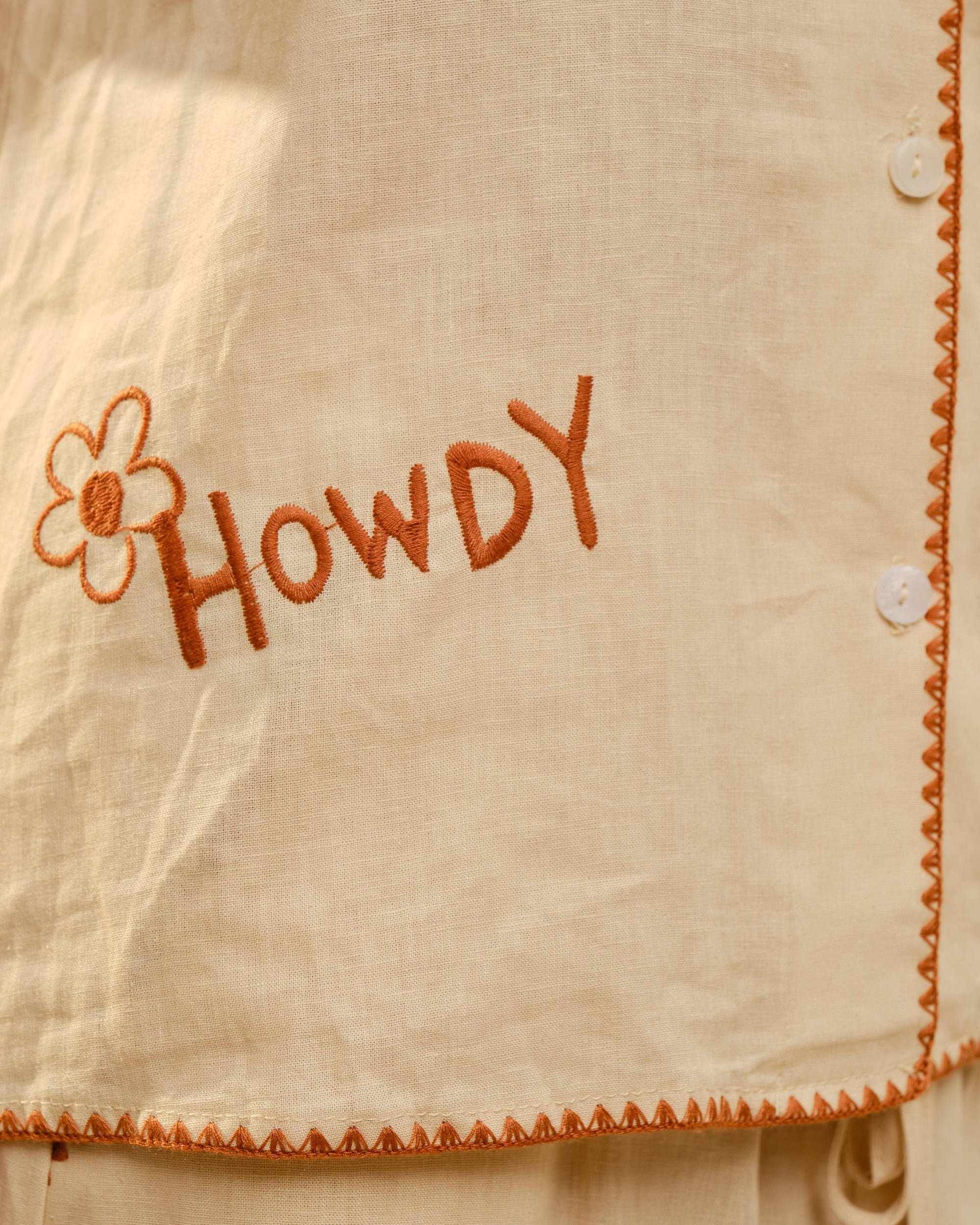 Easy, breezy, and full of Western charm. This two-piece set is the perfect outfit for relaxed summer days. Made from lightweight linen and finished with playful embroidery including boots, cactus, and a sweet “Howdy” detail.