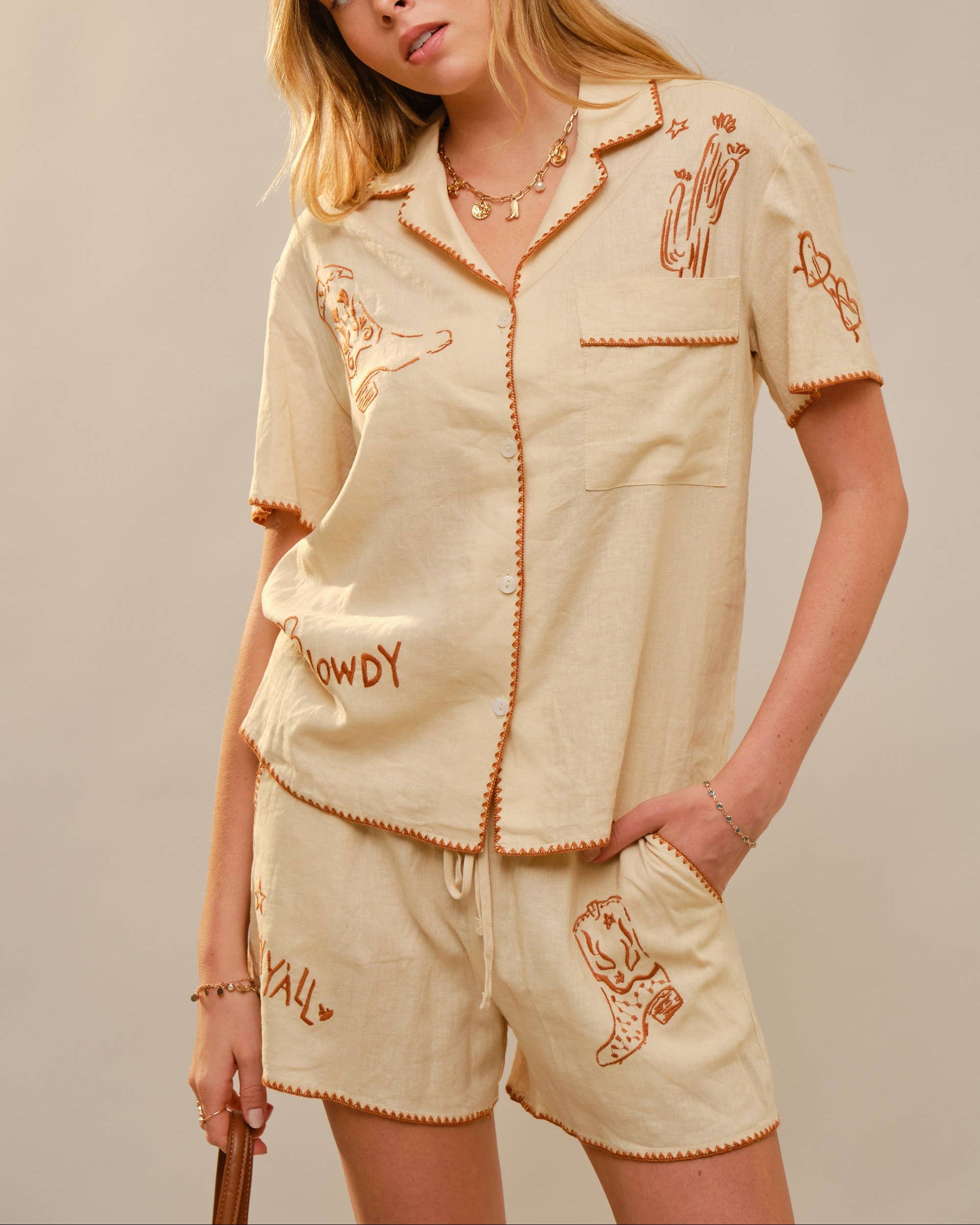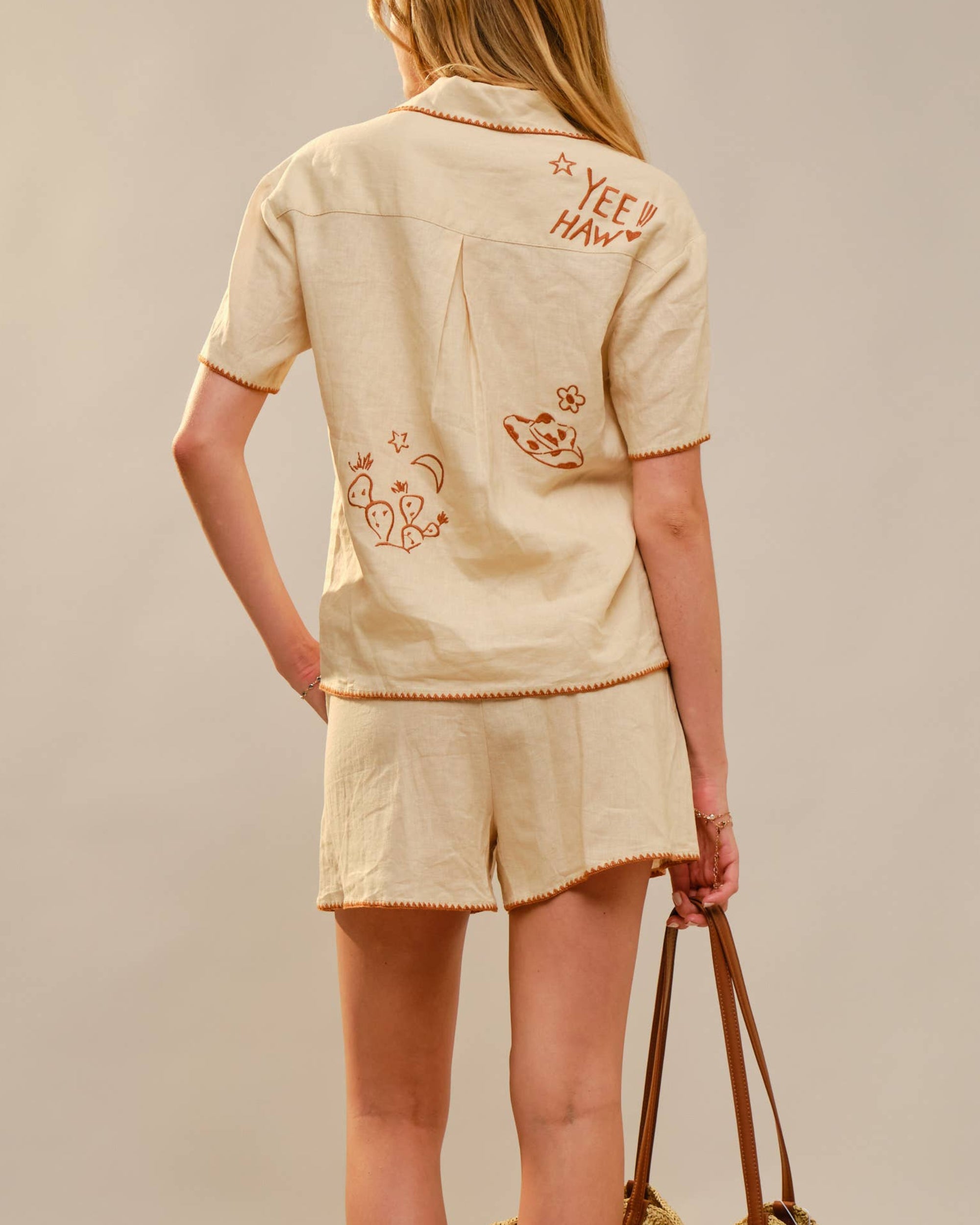 Howdy Cowgirl Embroidered Linen Shorts Set