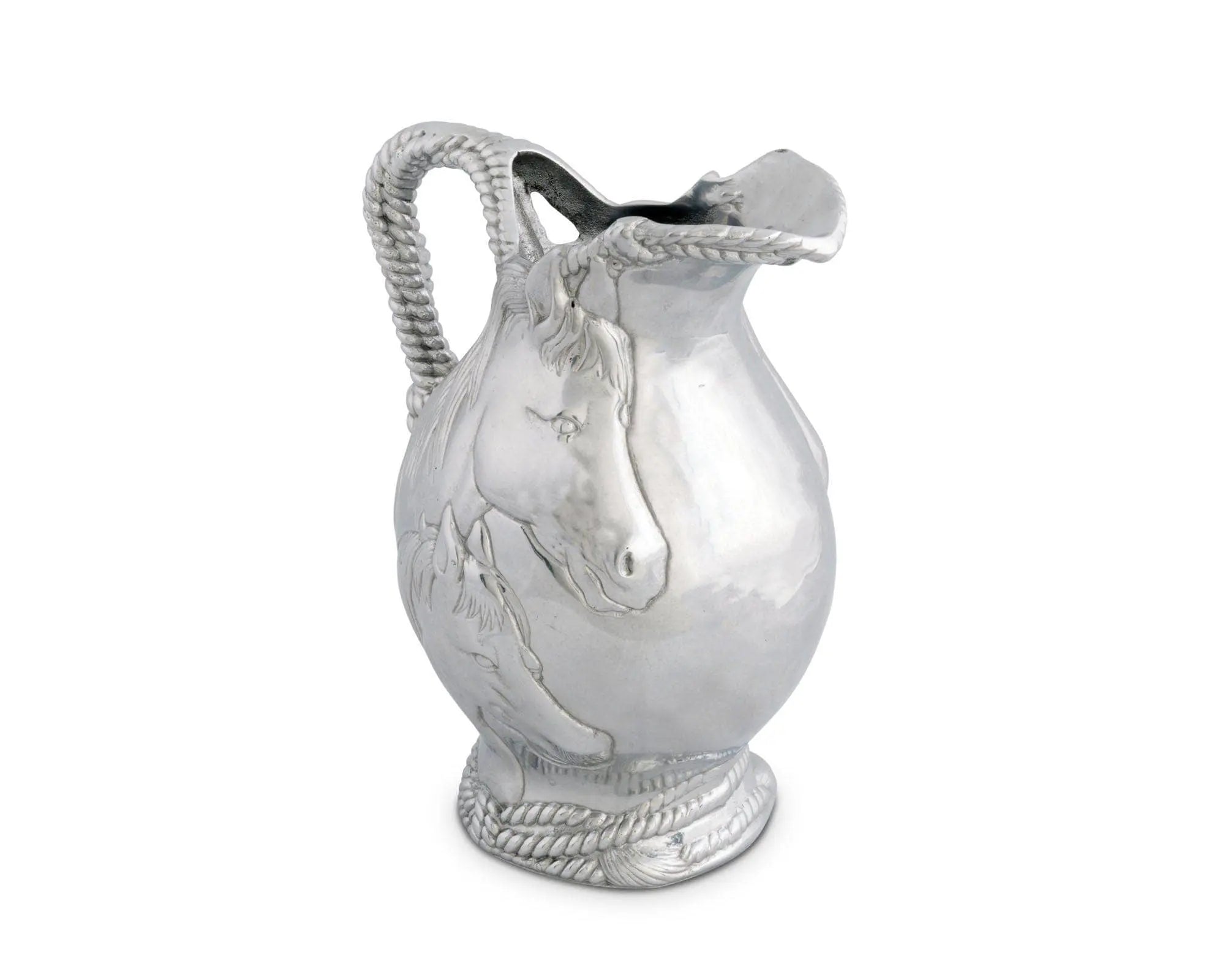 - Horses exhibit tremendous realism in their faces and manes as they display in the center of this handmade, aluminum pitcher