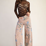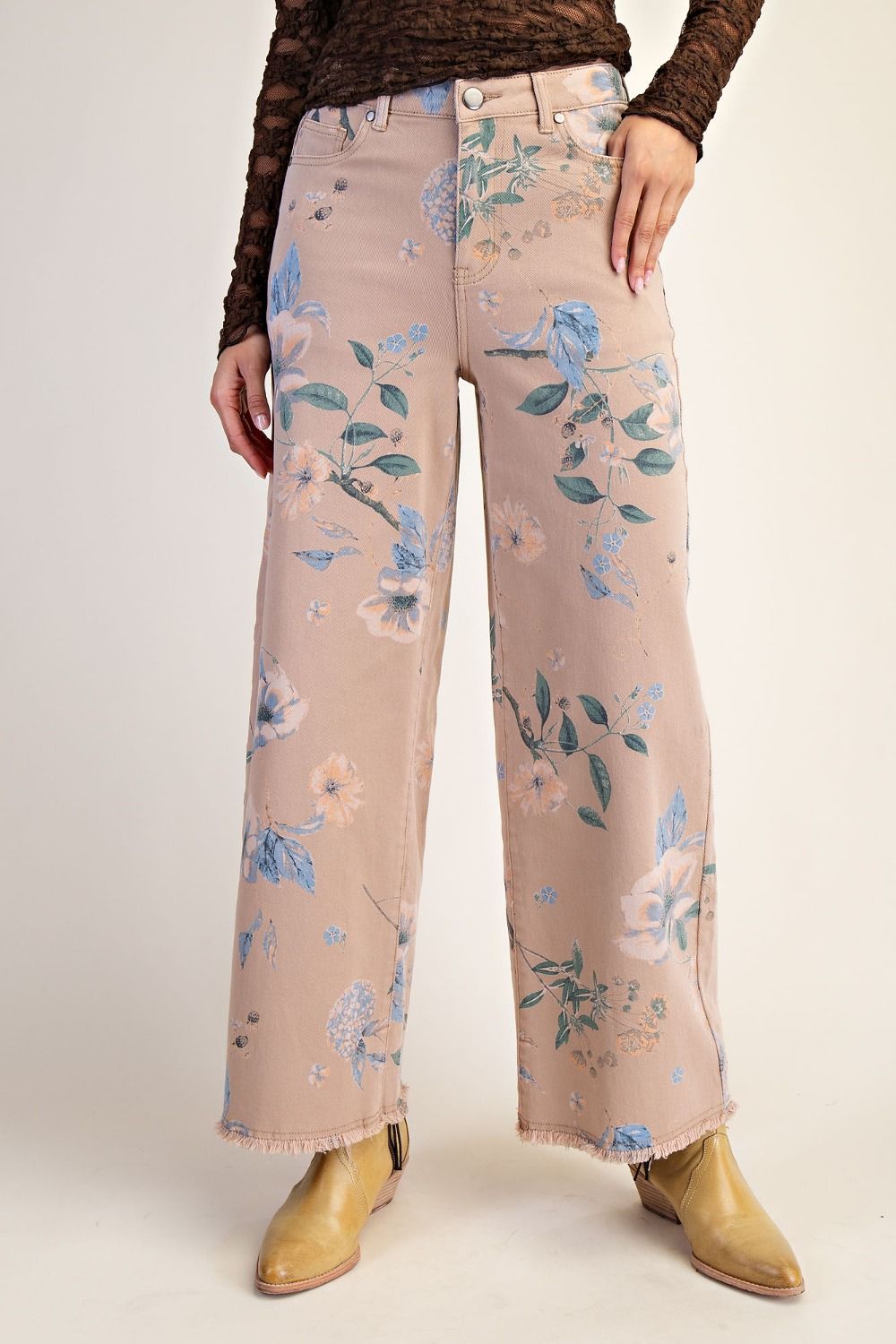High-waisted twill pants with a floral western print and soft, stretchy comfort.
