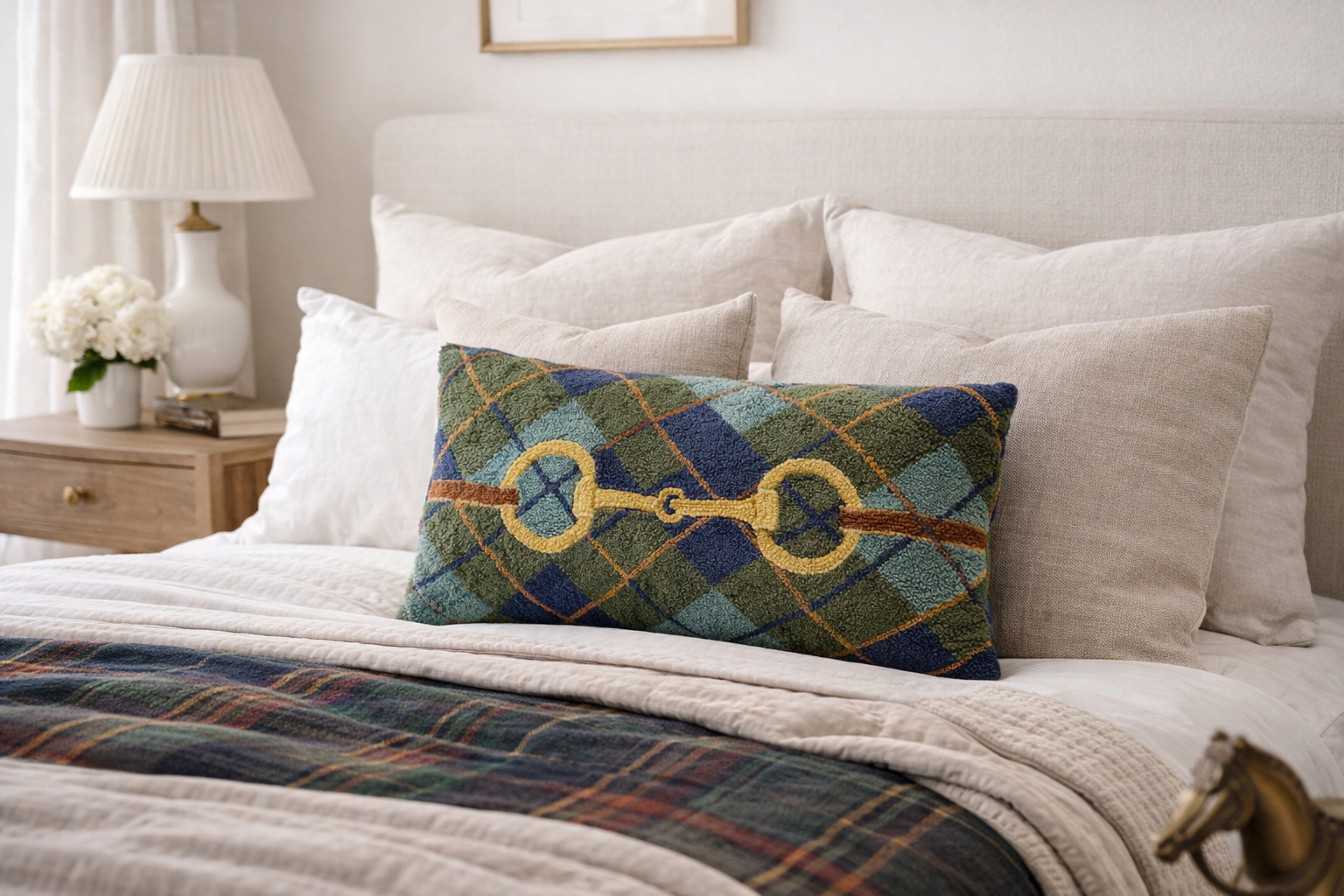 A charming plaid wool hook pillow accented with a classic horse bit design!