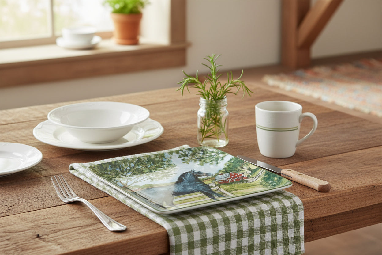 A rustic, heirloom-style dinner plate featuring elegant horse scenes in rich, earthy tones.