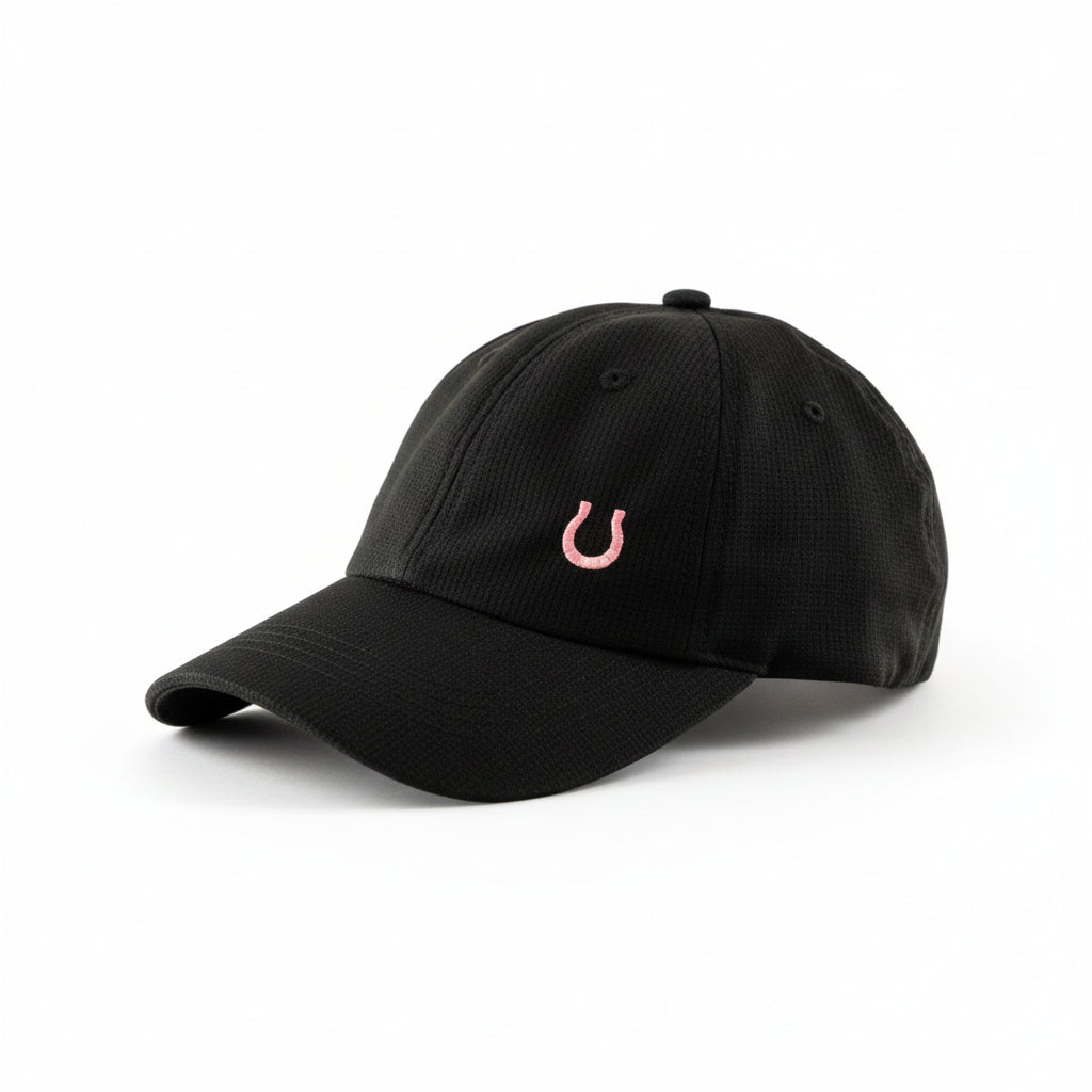 Love this hat—made from performance fabric that is cool and breathable—with the pink horseshoe embroidered on the left side.