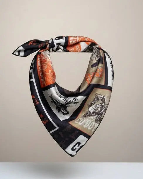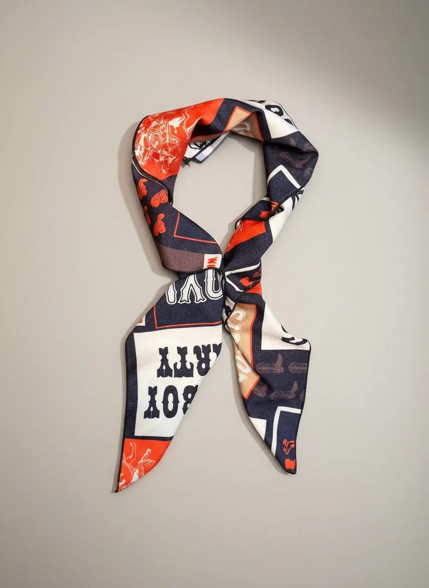 This scarf features a bold patchwork of vintage-inspired cowboy scenes, bronc riders, and classic “Howdy!” western graphics!