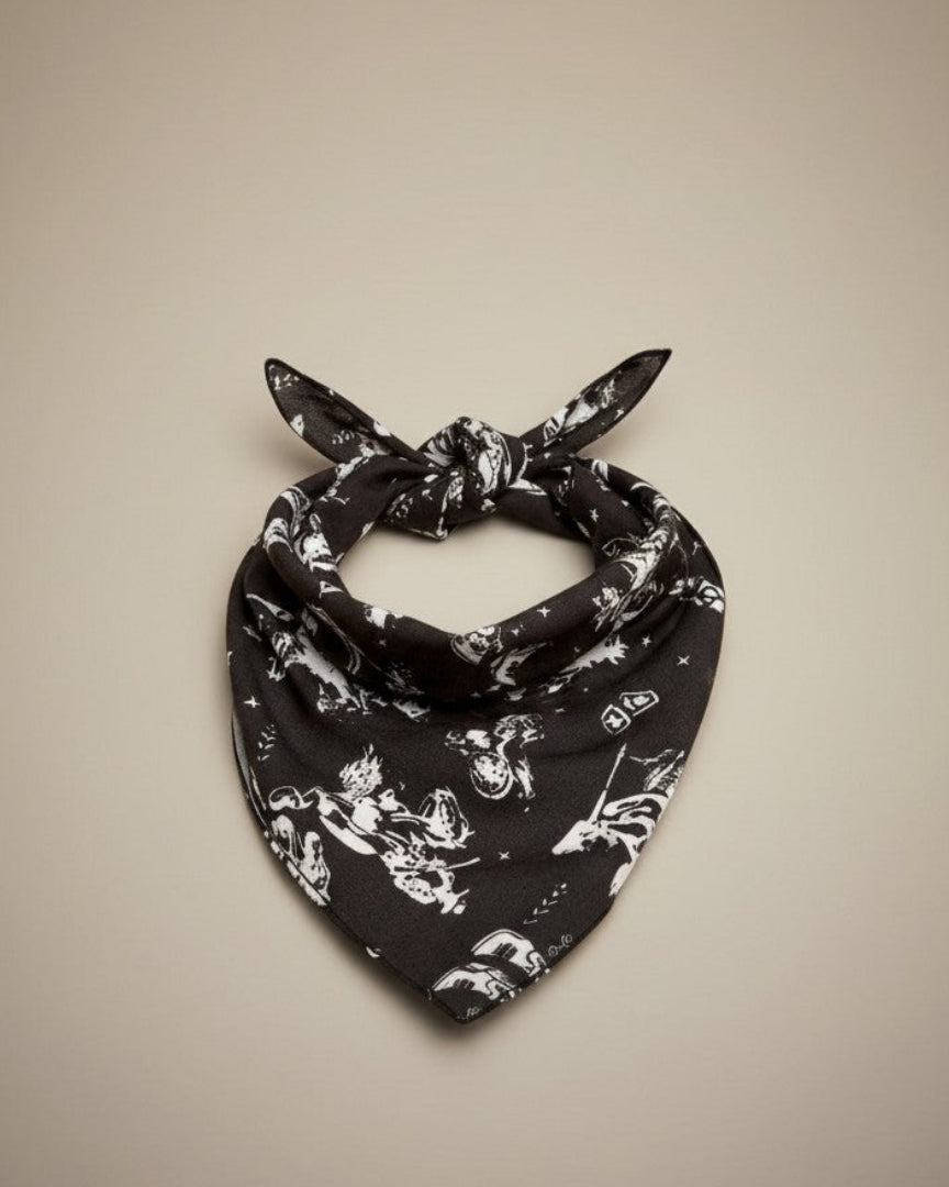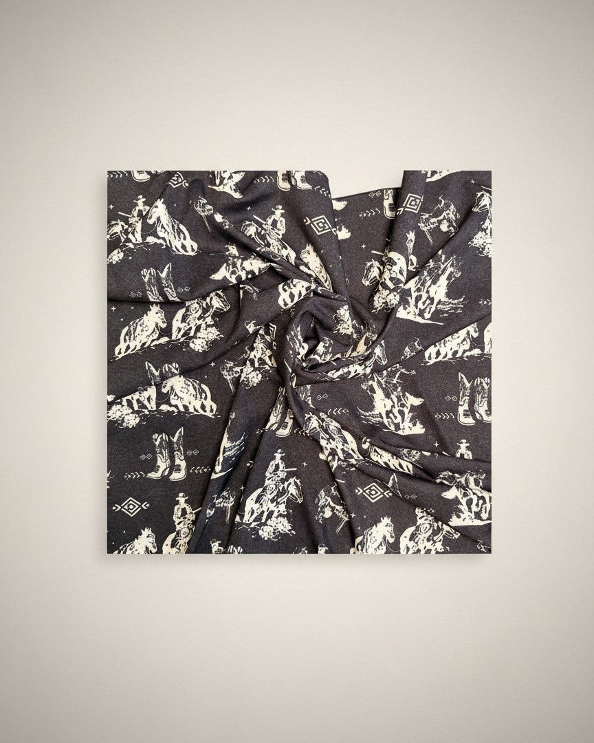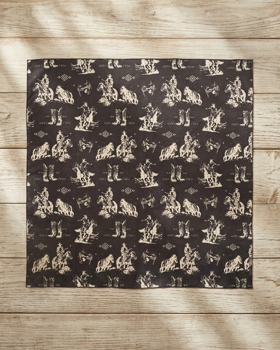 This vintage black scarf features a cowboy print with horses, riders, and boots set against a rich midnight background.