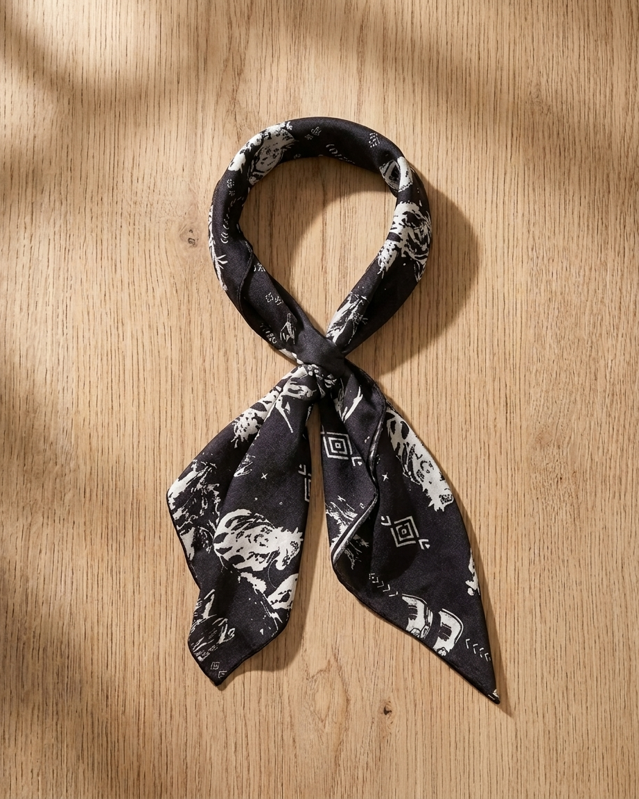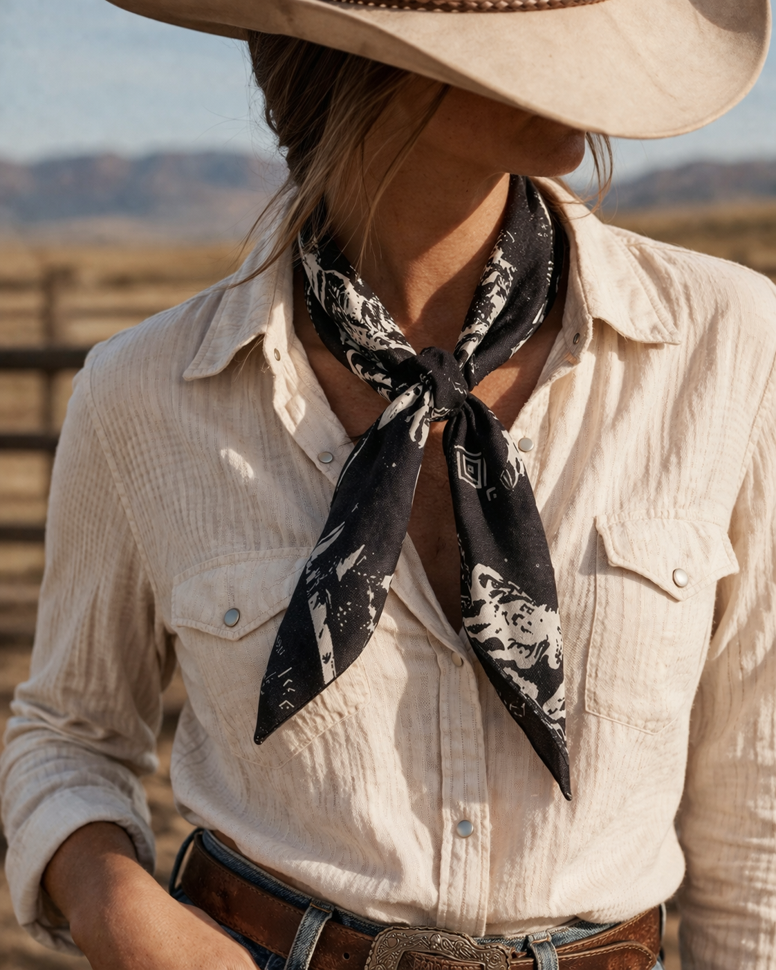 - Square, soft woven wild rag with vintage rodeo-inspired print