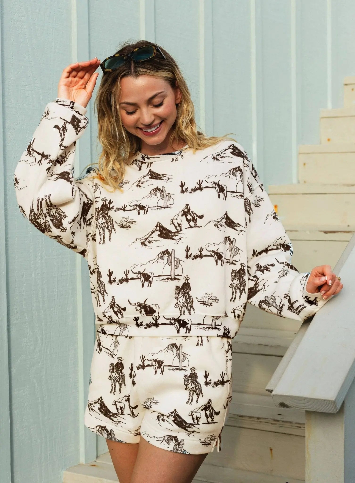 This adorable western matching set features a mid-length graphic fleece pullover with relaxed fit shorts for a comfortable and stylish look.