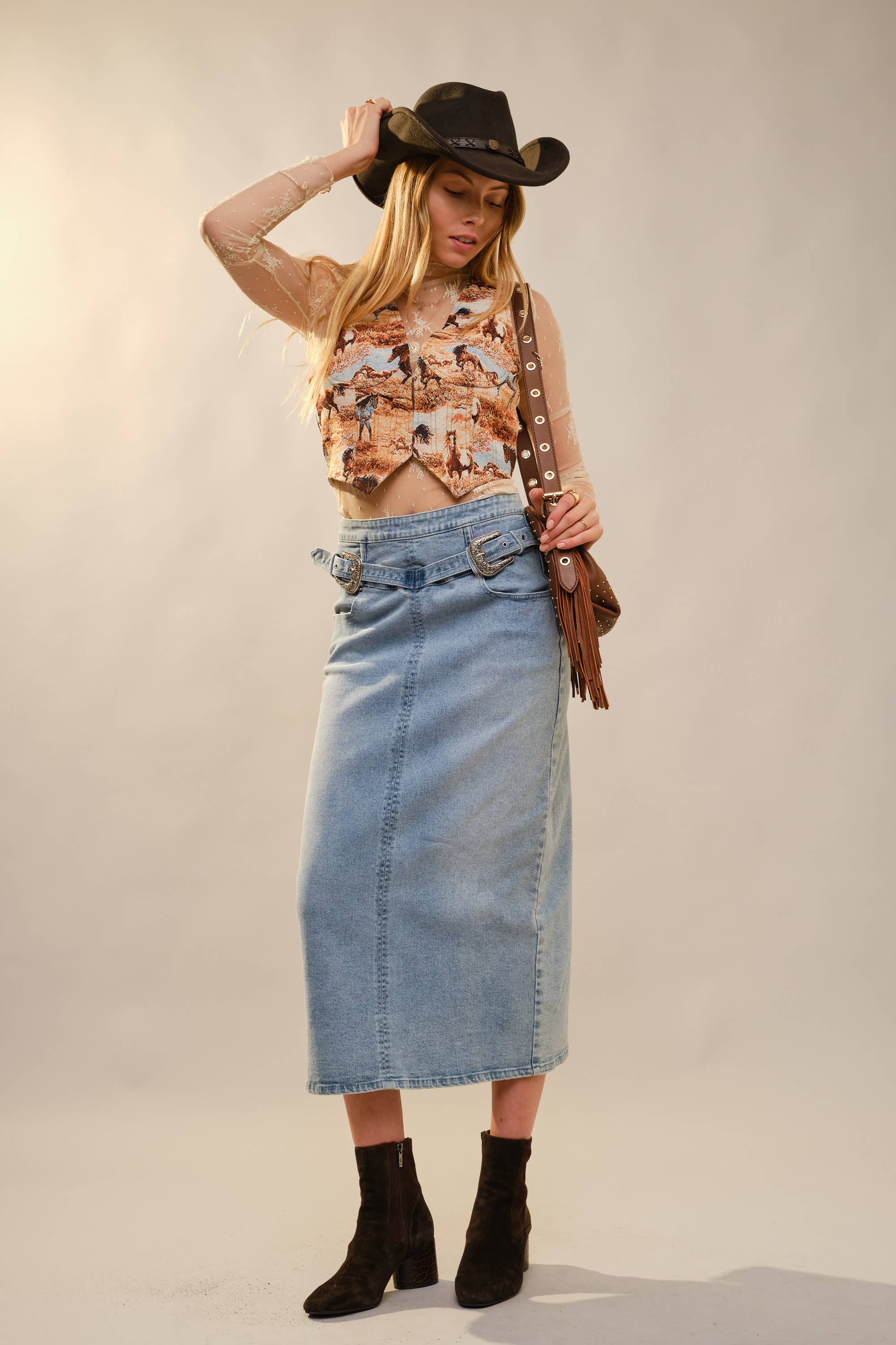 A tailored jacquard vest with an allover western horse scene and timeless cowboy flair.