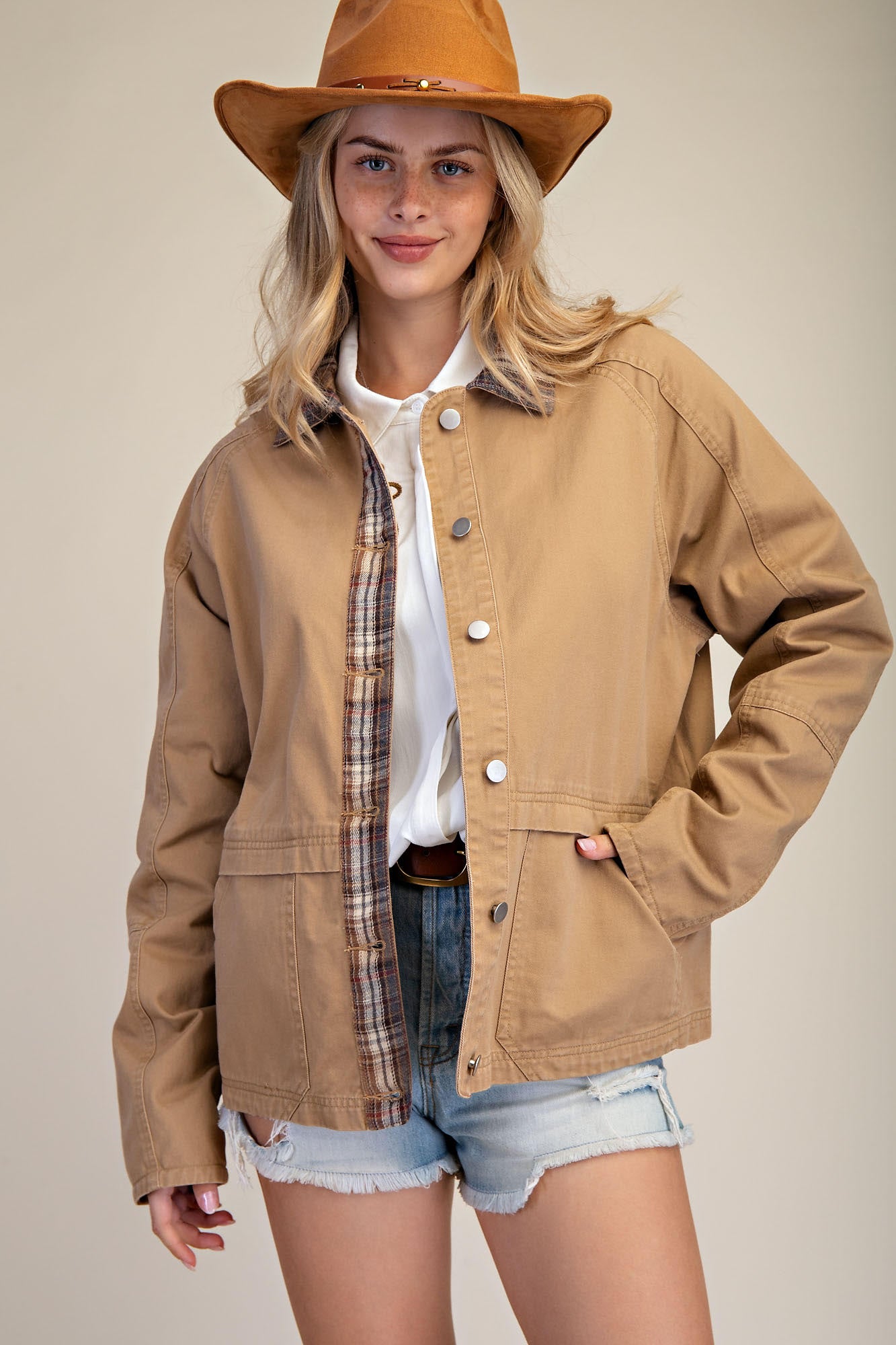 An oversized utility jacket with a washed twill finish and western-inspired plaid detailing.