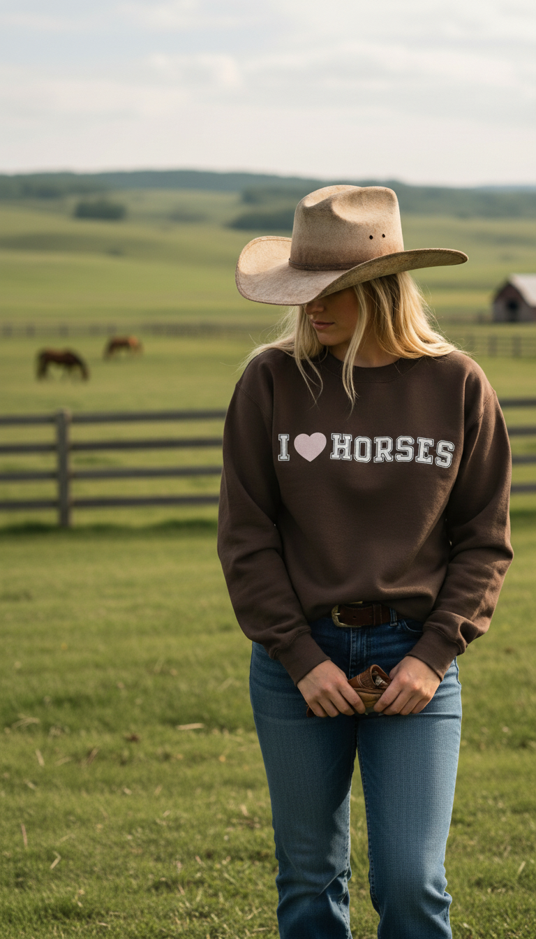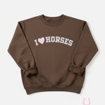 - "I 🩷 Horses" and a soft pink heart screen printed on the front