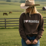 For horse lovers at heart, this adorable I Love Horses sweatshirt celebrates the joy of horses in the simplest, happiest way. Designed as a cozy, feel-good staple for life at the barn and beyond. It features a lucky pink horseshoe on the back...symbolizing good luck, hope and great things coming your way!
