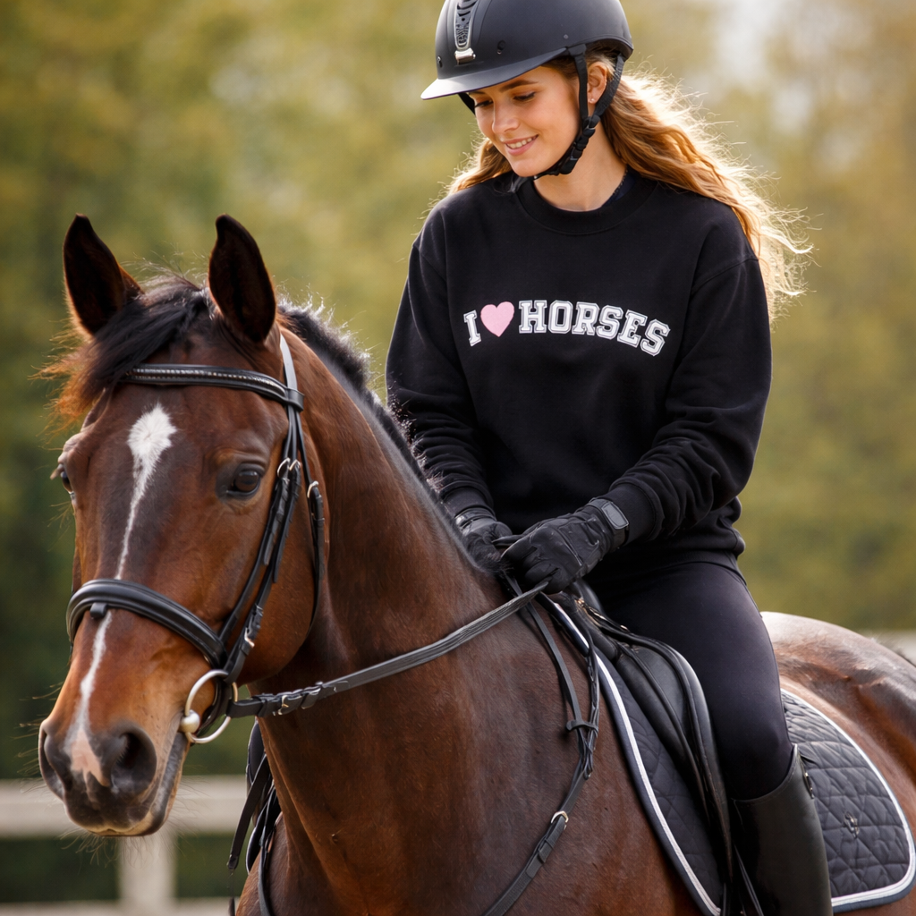 • "I 🩷 Horses" and a soft pink heart screen printed on the front