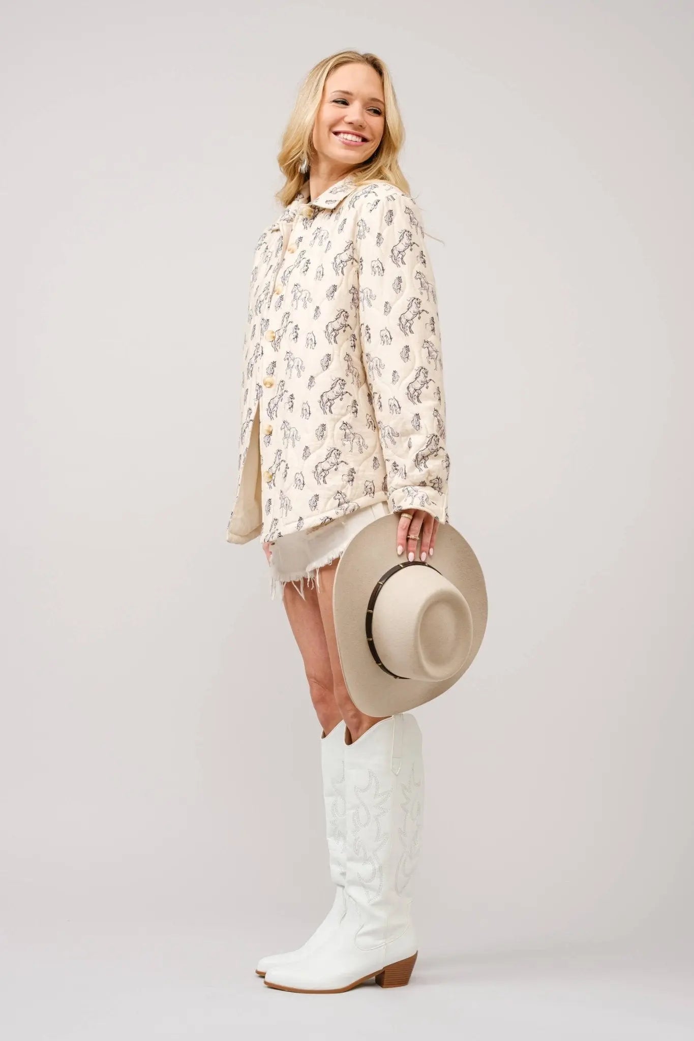 Esta jaqueta acolchoada sedosa é linda, apresentando um design exclusivo de estampa de cavalo e fecho clássico de botões!