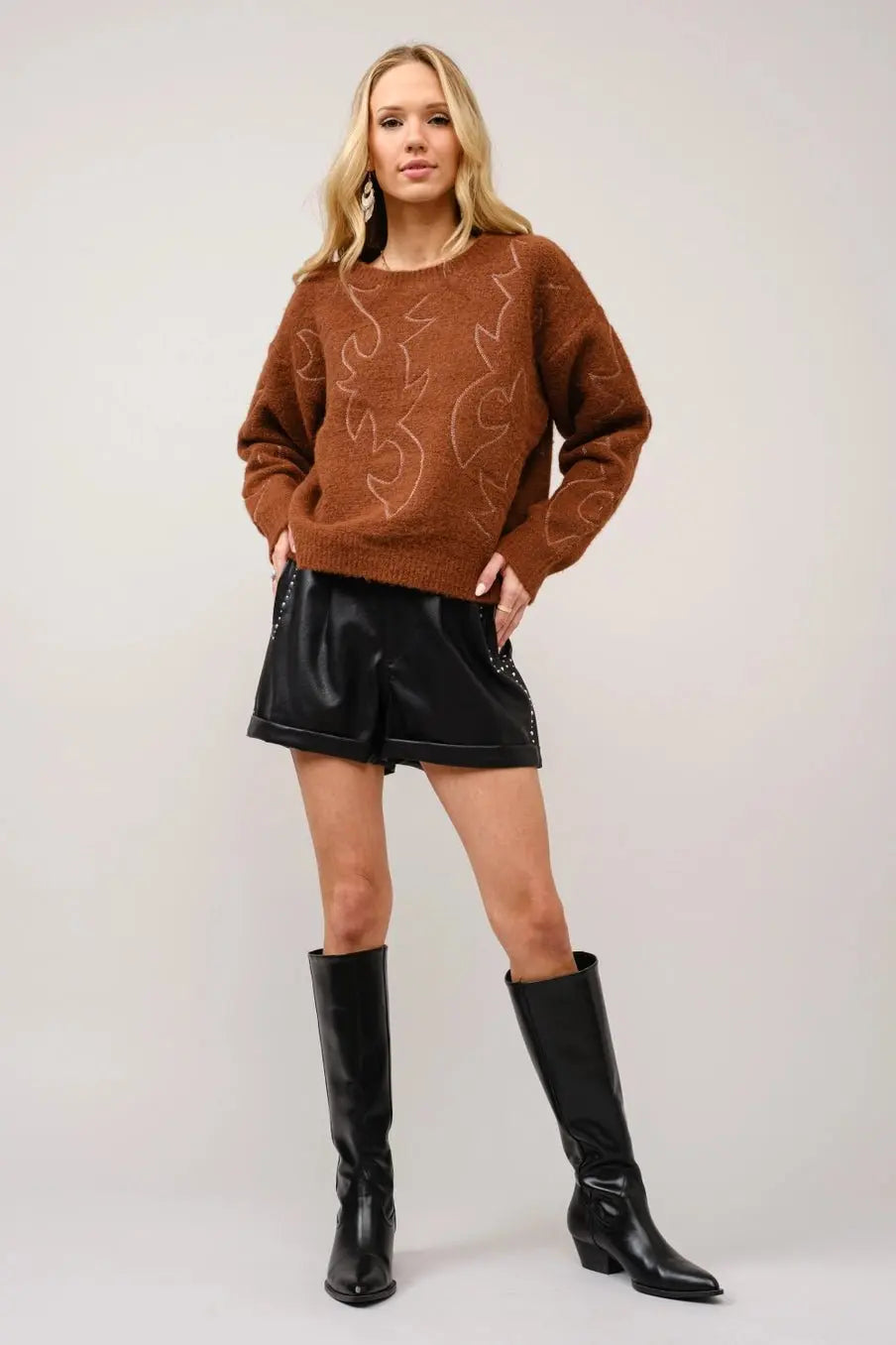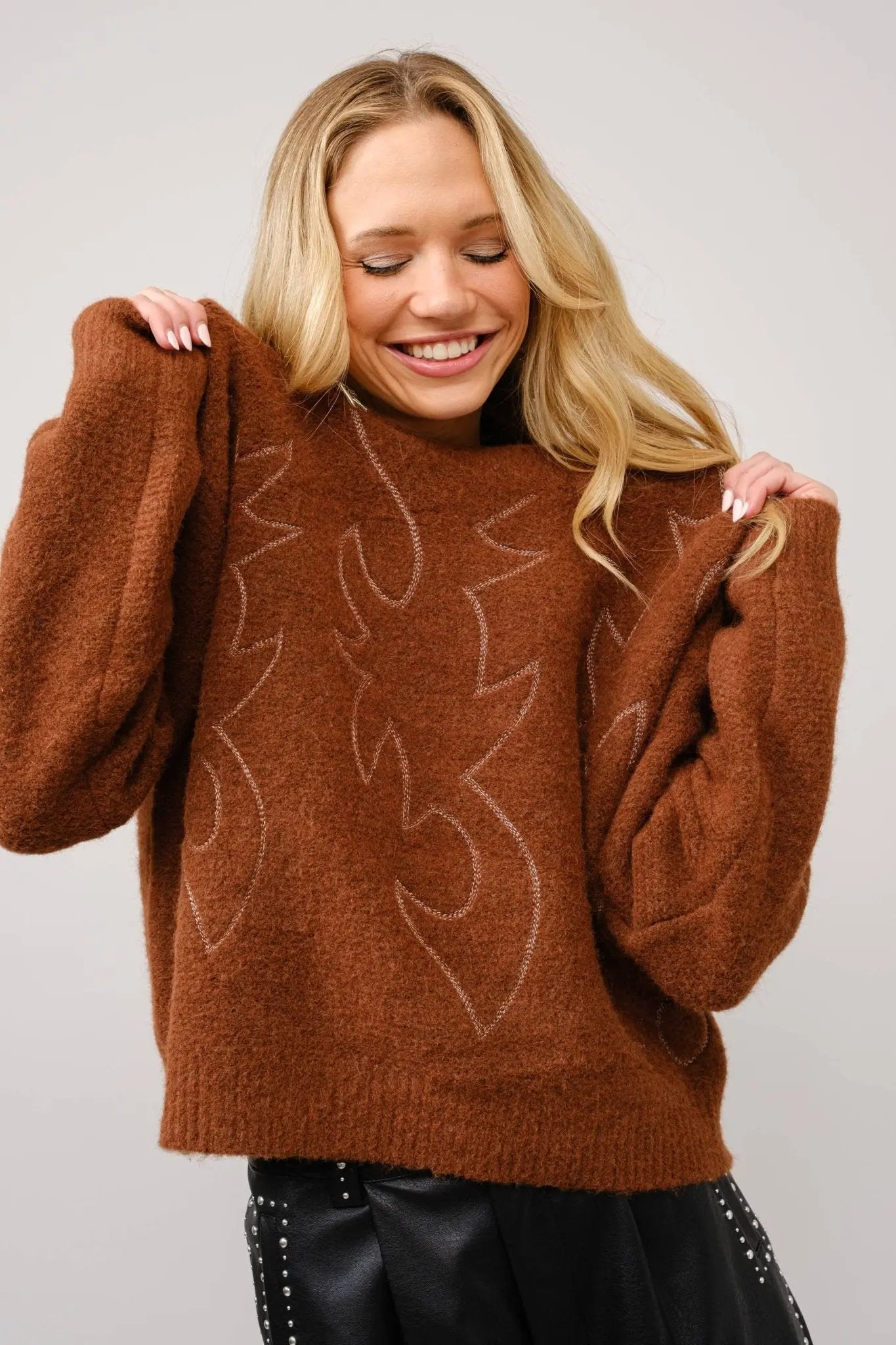 Um aconchegante suéter de gola redonda com um padrão exclusivo de costura de bota ocidental, perfeito para adicionar um toque de charme rústico ao seu guarda-roupa.